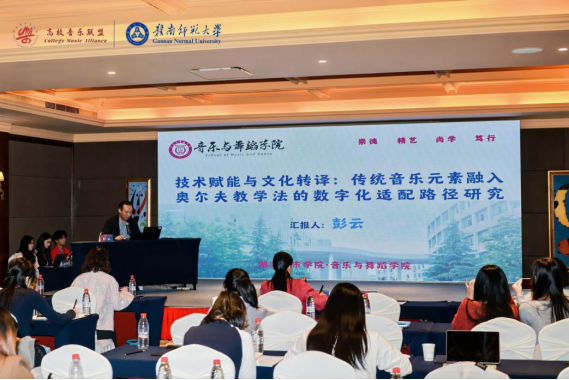 在主旨报告环节,国内音乐教育界知名学者围绕“‘世界百年未有之大变局’下的中国学校音乐教育”“美育高质量发展与音乐学科建设”“中华母语音乐文化教育话语体系构建”等关键议题发表真知灼见,提出了一系列具有引领性的学术观点。我校彭云老师认真聆听报告,结合自身研究方向与我校音乐教育专业特色,在交流环节就“技术赋能及文化转译:传统音乐元素融入奥尔夫教学法的数字化适配路径研究”提出思考,引发在场专家共鸣。