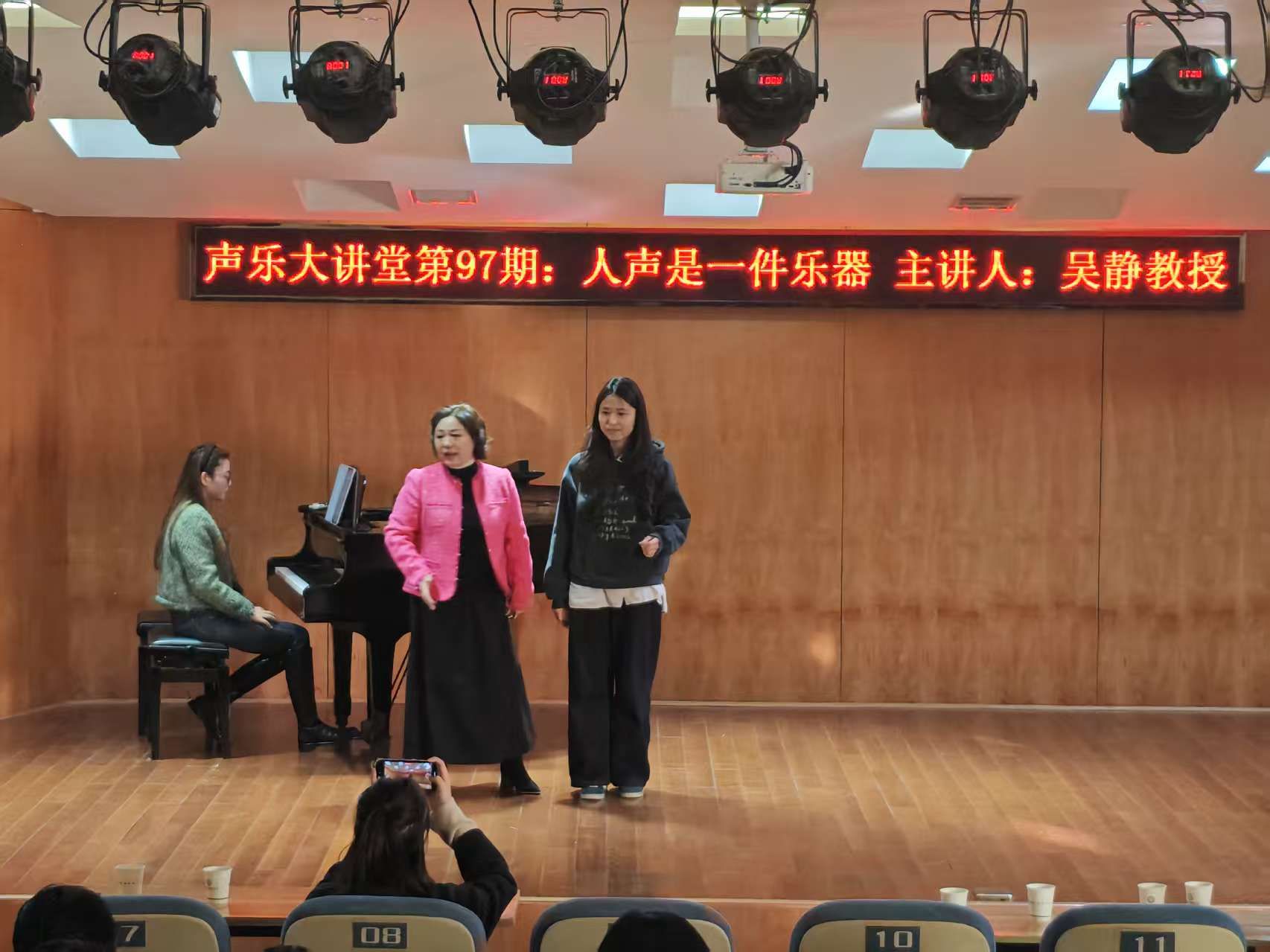 (通讯员 刘宏敏)2025年11月27日下午,由湖南省文化馆、省群众文化学会联合主办,湖南省群众文化学会声乐专业委员会承办的第九十七期“声乐大课堂”公益讲座在我院无源音乐厅举行。讲座由学院院长曹蕙姿主持,声乐教研室全体教师及学院 100 余名学生现场聆听。